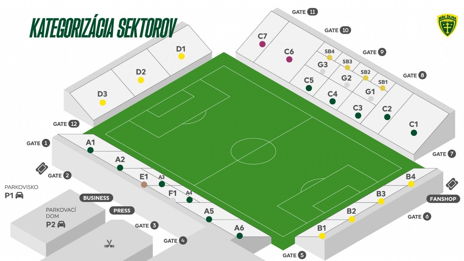 - prístupné iba pre hráčov, realizačný tím, delegované osoby, návštevníkov business boxov, médiá, určených hostí a ďalšie nahlásené ŠPZ.